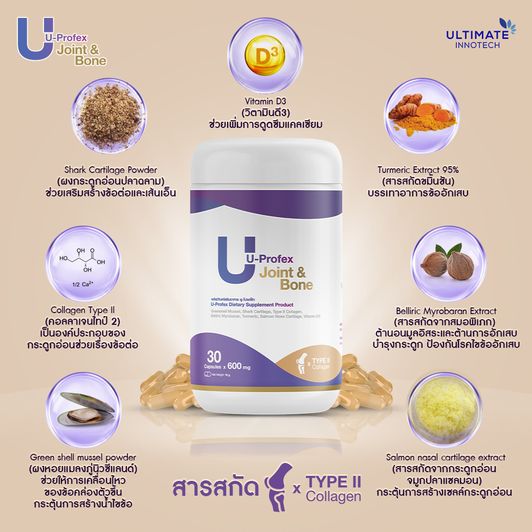เป็นองค์ประกอบของกระดูกอ่อน มีส่วนช่วยเพิ่มความยืดหยุ่นของระบบข้อต่อBelliric Myrobaran Extract (สารสกัดจากสมอพิเภก)