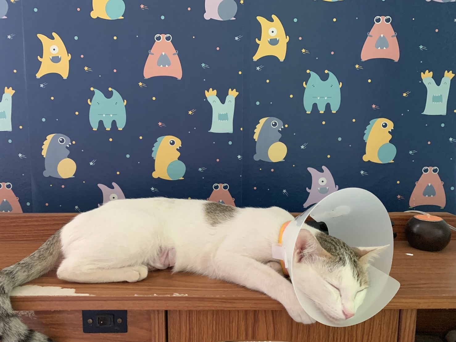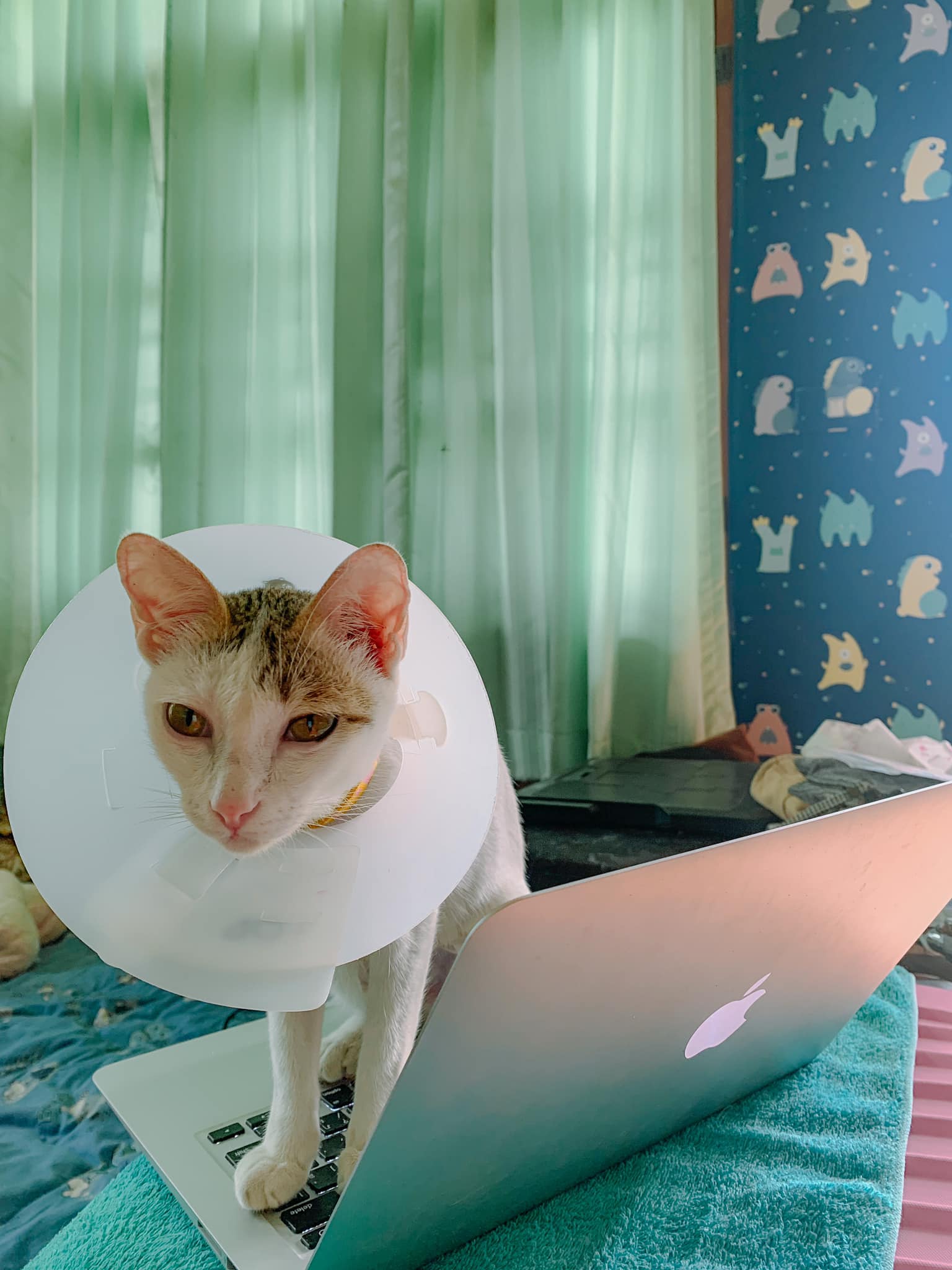 น้องตื่นตัวทั้งคืน พยายามจะลุก เราจะต้องดูแลน้องอย่างใกล้ชิด เพราะถ้าน้องล้ม น้องจะทับแผลตัวเองตรงที่ผ่าตัด ซึ่งก็อันตรายพอสมควร ช่วงเช้าก็เตรียมอาหารให้น้อง น้องกินข้าวน้อยลง หลังกินเสร็จ ก็ป้อนยาน้อง น้องทานยาเก่งมาก ไม่งอแงเลย (แม่แอบดมกลิ่นยา ยาเหมียวๆ หอม น่ากินมากกก) กินยาครบตามที่หมอสั่ง คุณหมอแนะนำว่าผ้าปิดแผลหลุดออกหลังจากผ่าตัดได้ 2 วัน ไม่ต้องตกใจ เปิดแผลแล้วก็เช็ดด้านข้างทำความสะอาดแผลเบาๆ พอผ้าปิดแผลหลุด เหมียวๆ ก็จะชอบเลียแผล แม่ต้องใส่ Collar ให้ น้องรำคาญ แต่ก็ต้องอดทนน๊า เหมียวๆ จะได้ไม่เลียแผลตัวเอง ซึ่งจะทำให้แผลหายช้า